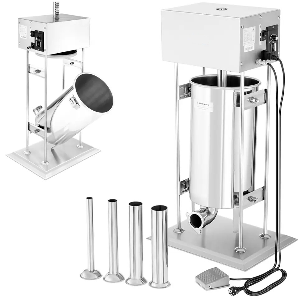 Električna polnilka za polnjene salam in klobas kapacitete 15L. Robustna izvedba INOX posoda, INOX ohišje, močan kovinski prenosni zobnik, odzračevalni ventil.